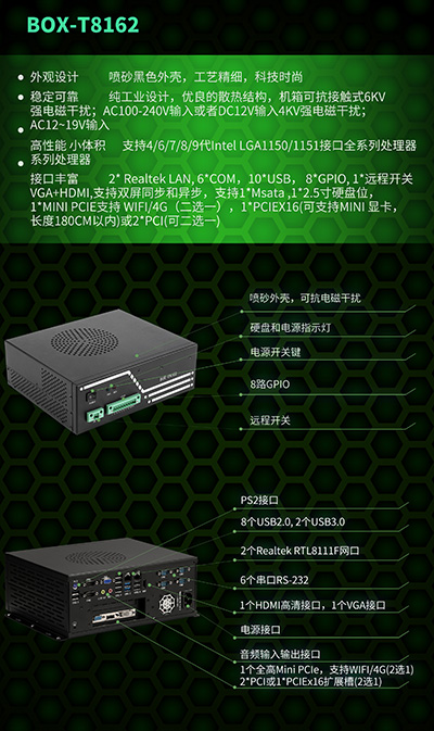 2個Realtek RTL8111F網(wǎng)口(10/100/1000M自適應),6個串口RS-232 (RS485需加模塊),8個USB2.0, 2個USB3.0,方便ODM定制,保證客戶現(xiàn)場復雜的應用需求;HDMI、VGA雙顯示接口,1路音頻輸入輸出;8路數(shù)字開關量GPIO(4*GPI,4*GPO,可自定義),1個遠程開關,1*mSATA,1*SATA 2.5"SSD用于存儲;1個全高Mini PCIe,支持WIFI/4G(可二選一),2*PCI或1*PCIEx16擴展槽(二選一), 用于集成各種附加卡,例如I/O卡,運動控制卡、視覺卡和GPU卡(可支持長度180CM的獨立顯卡)。能滿足不同市場的多樣化需求,可廣泛應用于工業(yè)制造、自動化檢測、工業(yè)視覺檢測、智能交通等領域。
