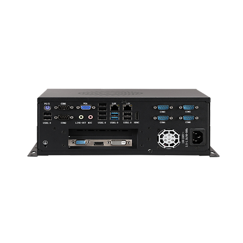 接口豐富 : 2* Realtek LAN, 6*COM,10*USB, 8*GPIO, 1*遠程開關,VGA+HDMI,支持同步和異步,支持1*Msata ,1*2.5寸硬盤位,1*MINI PCIE支持 WIFI/4G(二選一),1*PCIEX16(可支持MINI 顯卡,長度180CM以內)或2*PCI(可二選一)